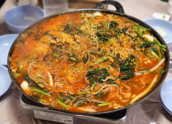 커다란 전골냄비 육수에 닭고기와 라면·쫄면·우동 사리에 쑥갓과 냉이를 듬뿍 넣었다 .